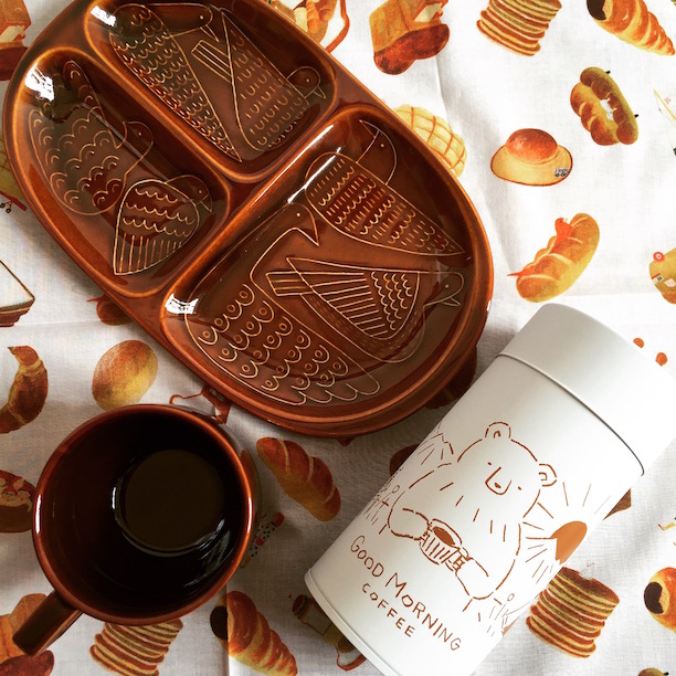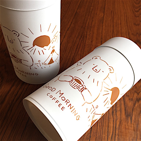 イラストレーター・高旗将雄さんのイラストを使ったコーヒー缶「GOOD MORNING COFFEE」です。コーヒーカップを前足で持つ、なんとも愛らしいクマ。その後ろには、テントやコーヒー器具が見えます。さらに後ろに見えるのは、山脈からのぞく朝日と、明るくなりつつある空に浮かぶ月。「まだ空に月が残る明け方、少しずつ差し込む朝日を見ながら淹れるコーヒーは、とてもおいしいと思うんです」と高旗さんは語ります。そんな、朝のコーヒーがもっと楽しみになるように、という高旗さんが願いをこめられたイラストは、マットな質感の缶に、焦げ茶色で描かれています。
